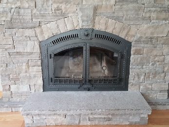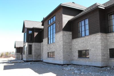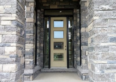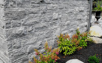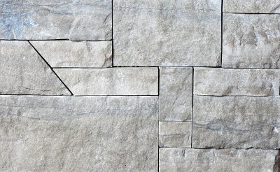 Sawn coursing stone veneer. Grey face colour. 4” bed. Sizes are mixed lengths of 8” to 24”. Rises 2.25”, 5”, 7.75”, and 10.5”.