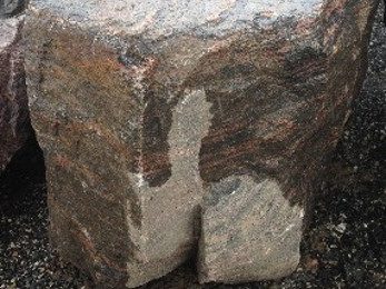 Sawn or random coursing stone veneer. Black/pink face colour. 4” bed. Sizes are mixed lengths of 8” to 24”.