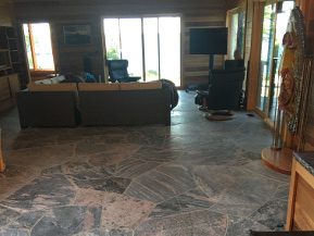 Sizes range from 8sq.ft. up to 12 sq.ft. pieces mixed on a skid. Thickness 2” Flamed Top, 3 Natural Edges and 1 Sawn Edge.